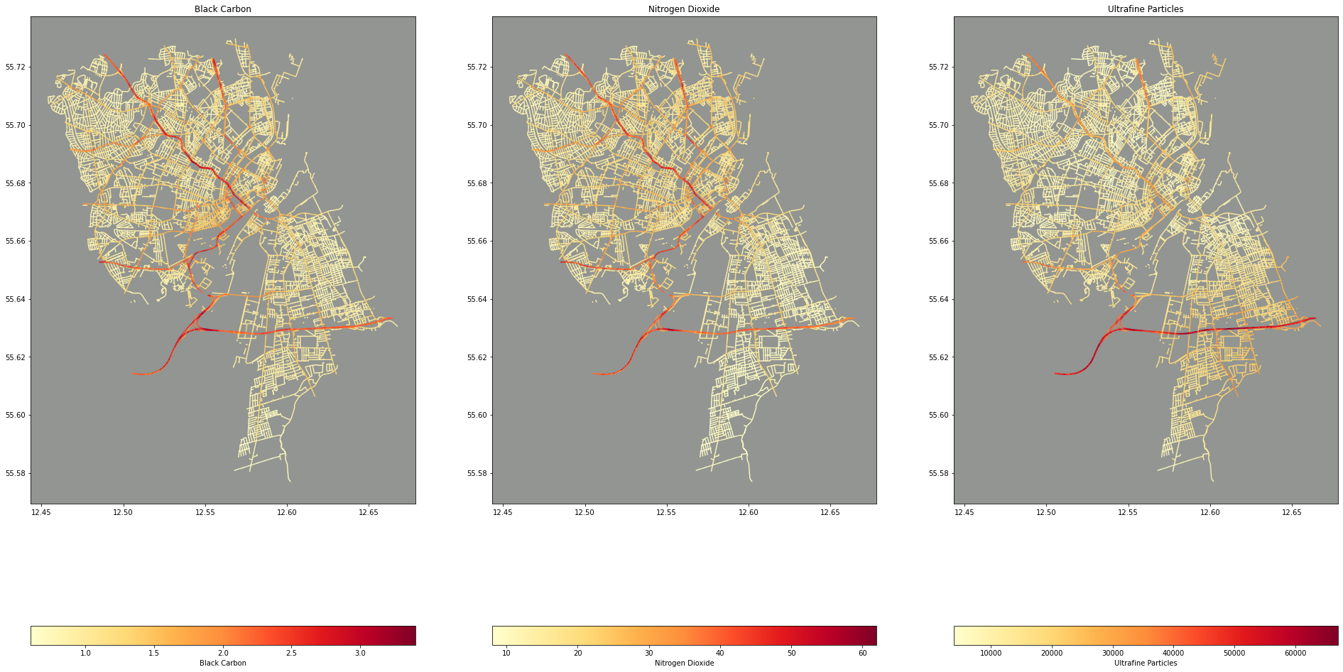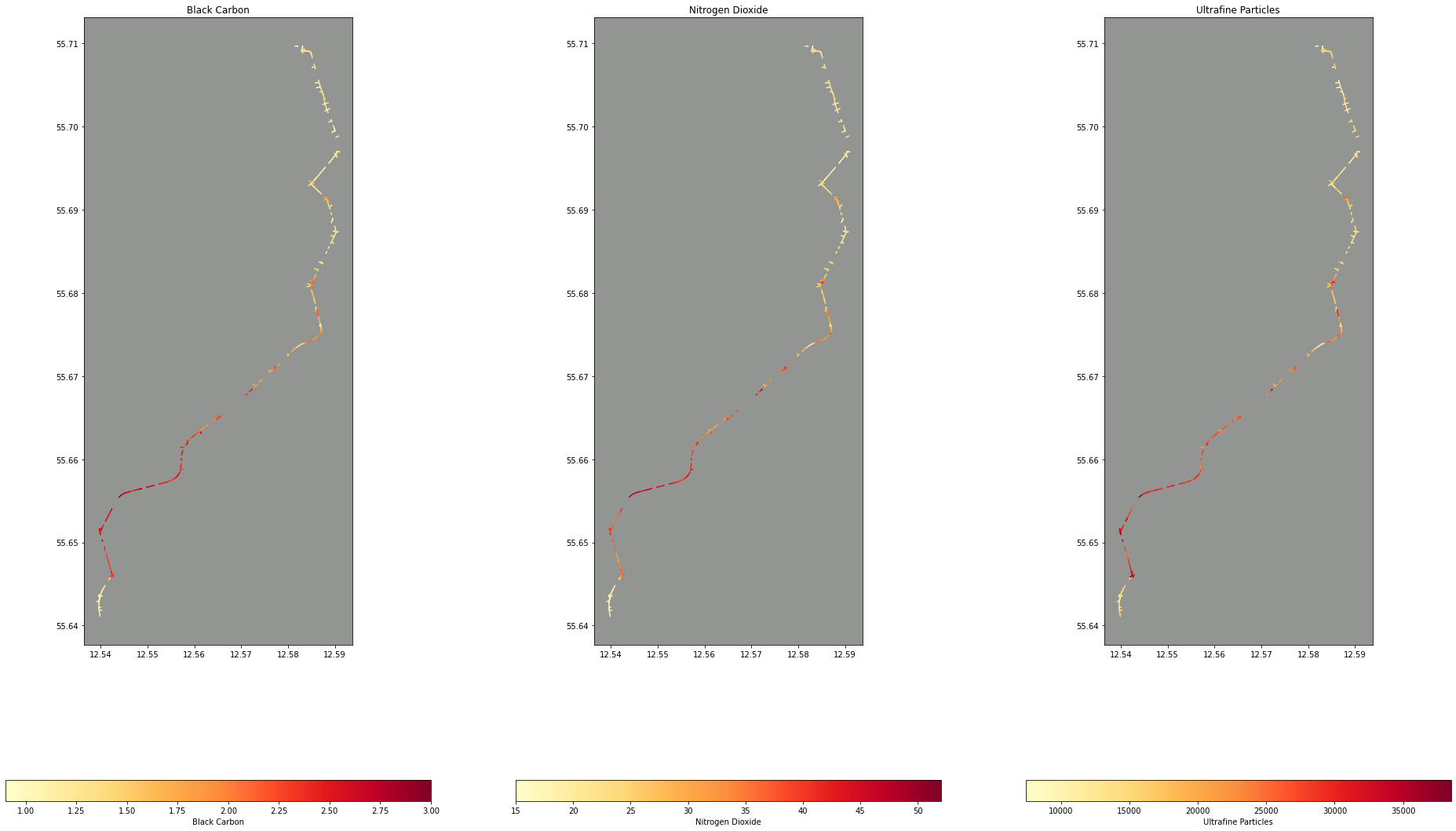 intersections.plot(column="Mixed_UFP", ax=ax[2], legend=True, legend_kwds={'label': "Ultrafine Particles", "orientation": "horizontal"}, cmap="YlOrRd")