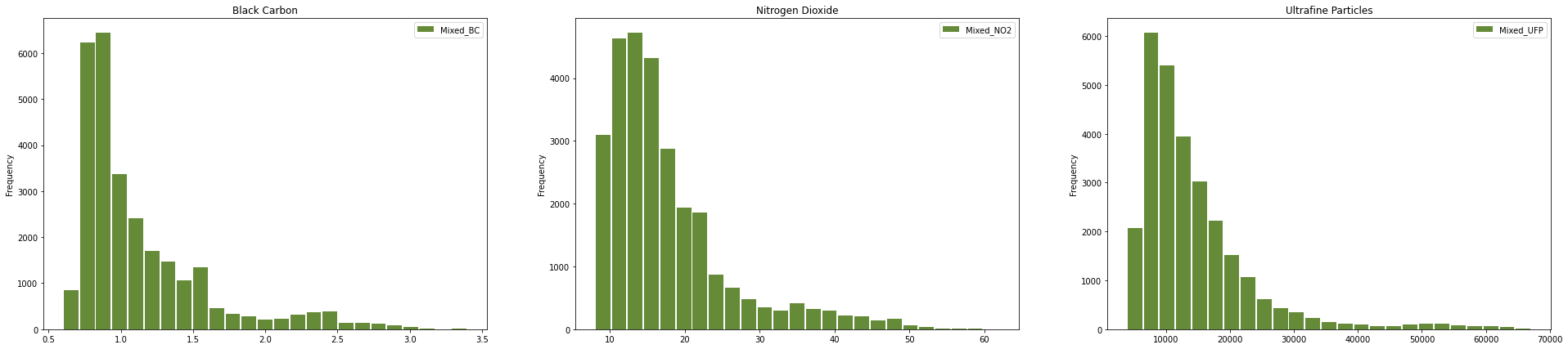 cleaned_data.Mixed_UFP.plot.hist(bins=25, color="xkcd:moss green", rwidth=0.9, ax=ax[2], legend=True)