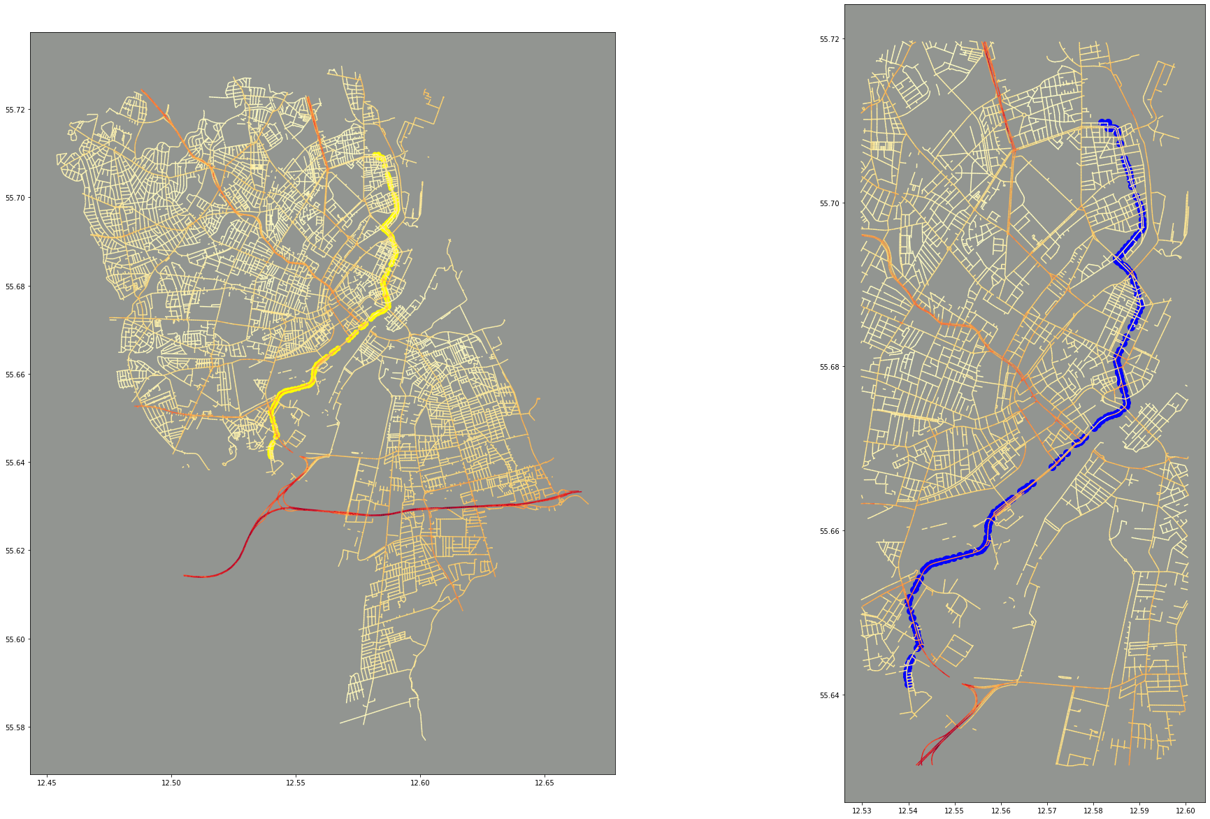 route.plot(ax=ax[0], marker='o', color='yellow', markersize=50)